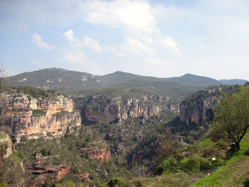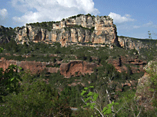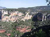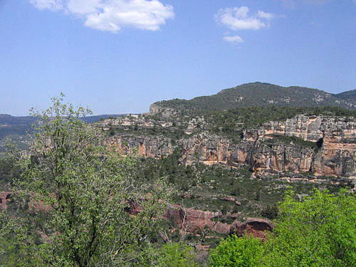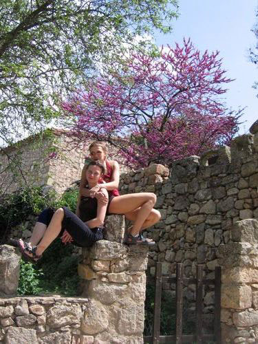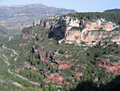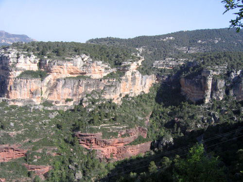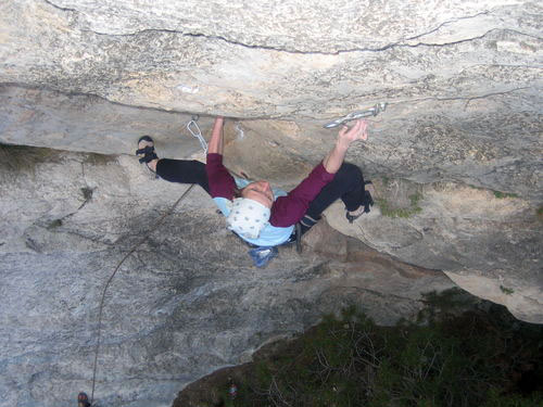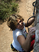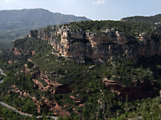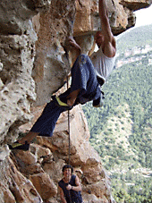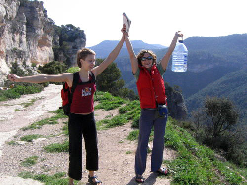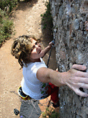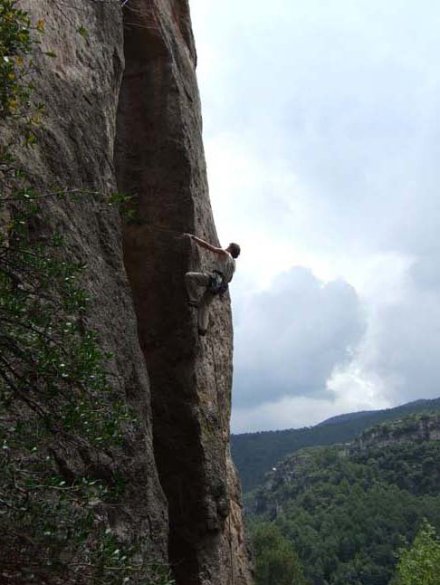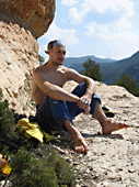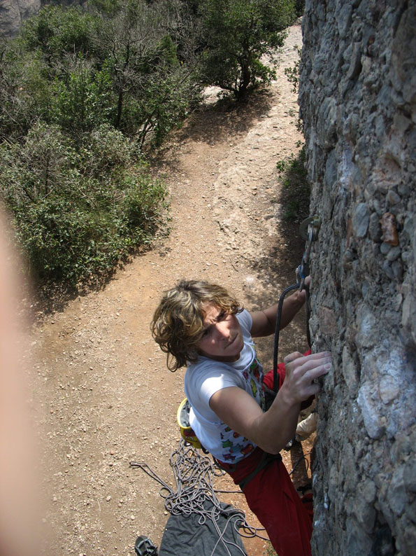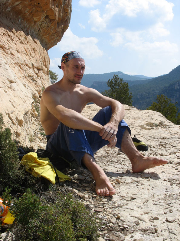 И не надо возгласов типа «фу, обленились» или «эх, скалоллазы». Да, а что? Можно хоть раз в жизни и просто по скалам полазить и пешком не ходить:-) Ведь приятно же, да?! Итак, утомленные испанским солнцем, добрались мы до скал, которые...хм. Тут я должен сказать, что скалы выглядят очень красиво и внушительно, хотя и смахивают на огромные кучи говна, наваленные пару миллионов лет назад и удачно окаменевшего под воздействием все того же испанского солнца. А при ближайшем рассмотрении они (скалы) похожи на бетон среднего качества. Порода называется конгломерат и представляет собой неисчисляемое количество камней и булыжников, воткнутых в скалу. Некоторые уже вывалились и получились дырочки. Ну не все так плохо, конечно. Скалы крепкие и не сыпучие, вот только почти нет нависаний и из-за огромного количества пестрых камней найти зацеп очень трудно. С виду зацепки везде, а не деле их нет, только мизера какие то. Хотя лазание по таким скалам довольно полезно в плане техники – тут нужно хорошо ногами работать и располагаться уметь. В первый день нам удалось победить одну 7а и на этом наши успехи кончились. Уставшие, но пока еще оптимистичные, мы решили, что завтра будет лучше. День грядущий принес нам только всякие разочарования. Разочарования в нас, потому что лазить по таким скалам мы не умеем и разочарования в мультипитчах, которые тут же были переименованы в мультипиздчи. Хотя не один из последних мы и не попробовали, но того что мы в бинокль наблюдали, было достаточно, что бы туда не лезть. Не то что бы совсем не лезть, но сложные маршруты требуют большой выдумки и фантазии в плане организации страховки:-) А картинки в гайдбуке с петлей, намотанной на перпендикулярно торчащий из стены камень в качестве промежуточной точки страховки, навеивали какие-то печальные мысли. В конечном счете Ваня с досады потянул (не сильно) самый страшный из всех пальцев. Ввиду чего и так же выше изложенного было принято решение перебираться в Сиурану, что в 3 часах езды от Монсерата.