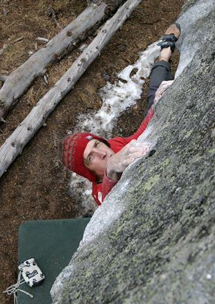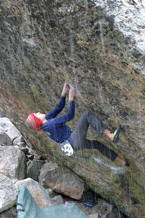 На боулдере уже была масса американских и японских скалолазов, большинство из них опробовало перехваты на Dark Waters. Я был одет в специальные тянущиеся штаны North Face, Gillet и парочку треккинговых ботинок Nuptse, что не вполне соответствовало стандартной одежде для боулдеринга, состоящей из мешковатых штанов и шапочки. Я помню их изумление: они подумали, что я профессионал, но продолжил разминаться на хапалках справа.