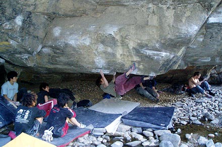 Стена, на которой расположена проблема, просто впечатляющая! 50 футов длиной, тридцатиградусное нависание и восемь линий от V6 до V14. NMGG находится справа и далее идет вверх по 15-ти футовой стене через пять зацепок к огромному ручкану на краю. Первый перехват это устрашающий плечевой жим с крошечного подхвата под полподушечки пальцев. Мне только раз удалось сделать это движение и к счастью для себя в ту же попытку мне удалось пробраться через верхний участок V10, завершив все диким броском к краю. Я был реабилитирован – моя первая V12 за выезд да еще и на такой потрясающей проблеме.