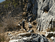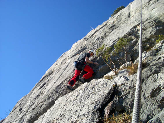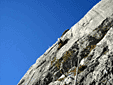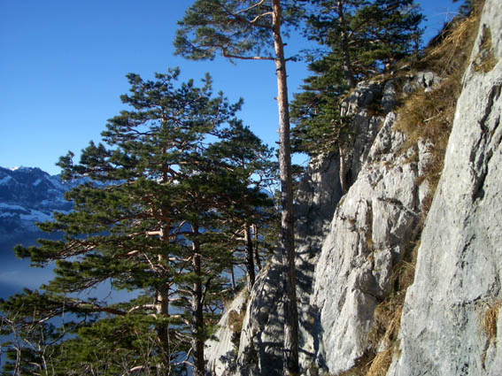 Место, к котому мы направлялись называется Suennenplaettli и находится на высоте 870м. над уровнем моря. Припарковав машину, мы пошагали вверх по дороге. У условного места (кучка камней на обочине), свернули и минут 10-15 ползли теперь уже "конкретно" вверх. Вот мы и на месте - небольшая площадка, чтоб переодеться и сложить вещи и узкая тропинка под скалой, чтоб было где встать страхующему. Надо сказать, что мы очень сильно погорячились, взяв с собой штаны и кофты и перчатки - уже ко времени нашего прибытия на место вполне комфортно было в футболке и шортах.