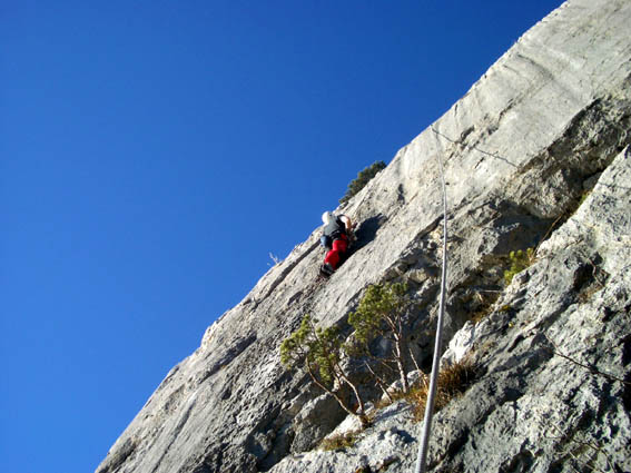 Через 1.5 часа внизу показались ещё одна пара скалолазов, а потом ещё одна. Шесть человек оказалось как раз для такого небольшого места (всего около 10 трасс). Мы попривествовали вновь пришедших, сделали легкий перекус остатками рождественского пирога, который пекла тетя Роба :), и я полез прикольную трассу с названием Wasserman (Водный человек). Посередине трассы в двух местах из скалы "бьёт" источник, соотвественно и сама трасса сделана с изгибом в обход стекающей по скале воды. Категорируется как 6а+, мне очень понравилась. К этому времени (около 12) солнце вышло "в зенит", температура на термометре сотового телефона, подобралась к 25 градусам. Я решил, что можно даже загореть, и дальше лазал без майки :)