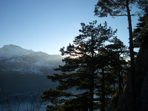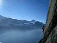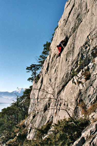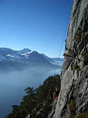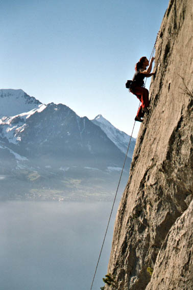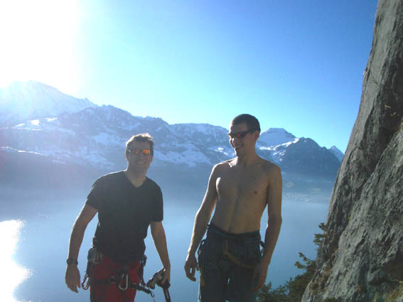 Вид сверху был просто потрясающий - внизу в дымке виднелось озеро Люцерн, а над ним горы, а над ними - солнце, а вдалеке ещё горы, покрытые снегом! Сделав первые фотографии, мы приступили к лазанию. Маршруты на этом месте практически все длиной метров по 25. Скалы отличные - остренькие, с большим количеством дыр, не крошатся, - красота! Размявшись парочкой простых маршрутов, мы постепенно перешли на более сложные. Лазание было довольно халявным - из описанных маршрутов самый сложный был 6б, правда были набиты ещё несколько неописанных, но это видимо "для знатоков места", категории было даже не представить, слишком сложно :) Так вот неторопливо пролезали мы трассу за трассой.