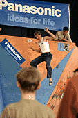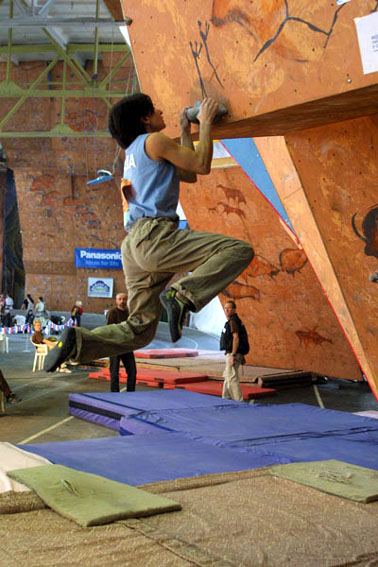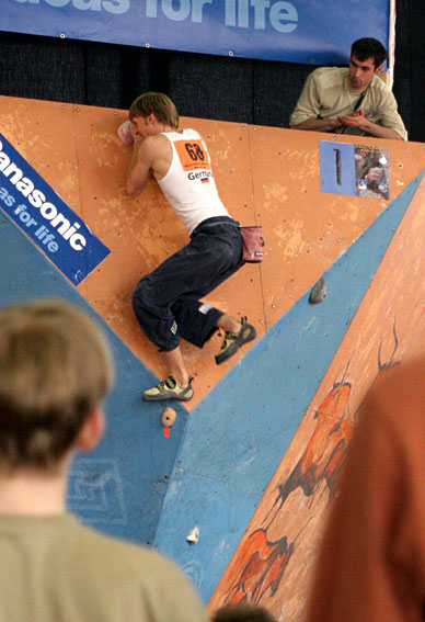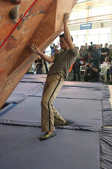 Мужской финал. Зрелище не для слабонервных. Первая трасса – разминочная для монстров. Ее делают практически все. Явно волнуется Дима Шарафутдинов и выступает гораздо хуже своих возможностей. Красавчик Дю Лак эпизодически улыбается для камер, но, похоже, сегодня не его день. Вторая трасса – дикий прыжок из-под нависания с двух пассивных рельефов на зацепку за перегибом. После поражения Дю Лака и безуспешных попыток других спортсменов, неожиданно элегантно и легко бонус берет Салават. С первой попытки. Дальше зацепок вообще нет. На этом самом бонусе надо накатить и выйти наверх. Этот подвиг Салавату не удается (а жаль, стоило бы повторить попытку, практически то же чудо он совершил на шестой трассе на России, что и принесло ему первое место). С четвертой попытки этот же бонус берут австриец и француз, остальные позорно сливают вторую трассу. Рядом стоит Жаки Годофф, главный подготовщик, и смотрит на результат своих рук. Потом смущенно пожимает плечами, улыбается и уходит.