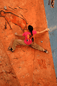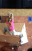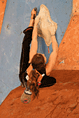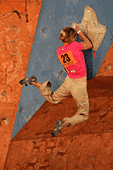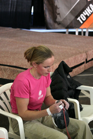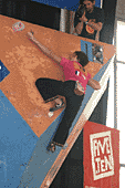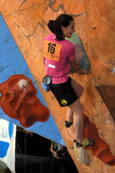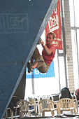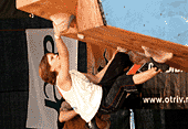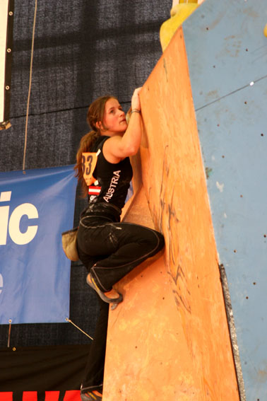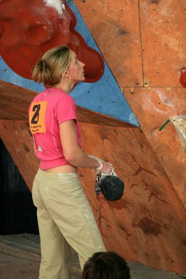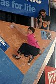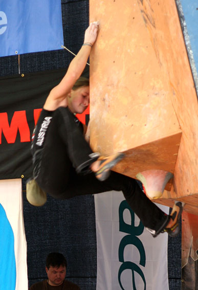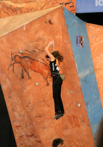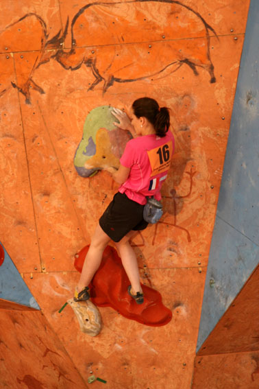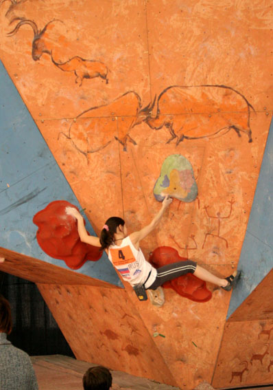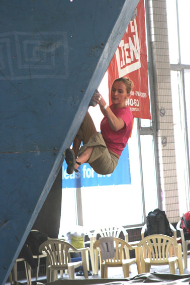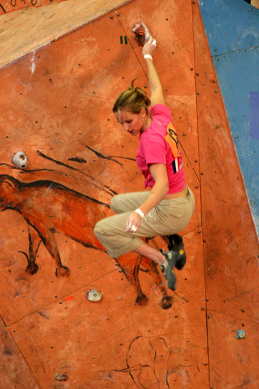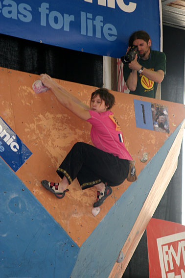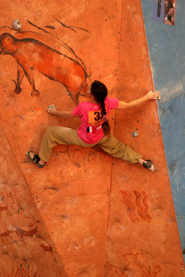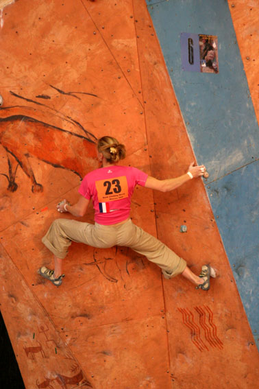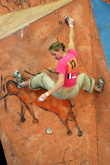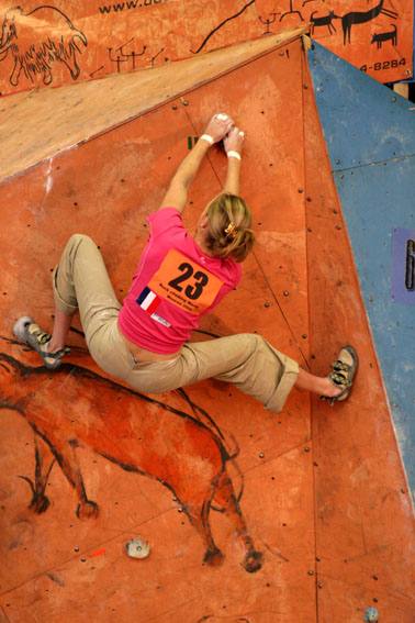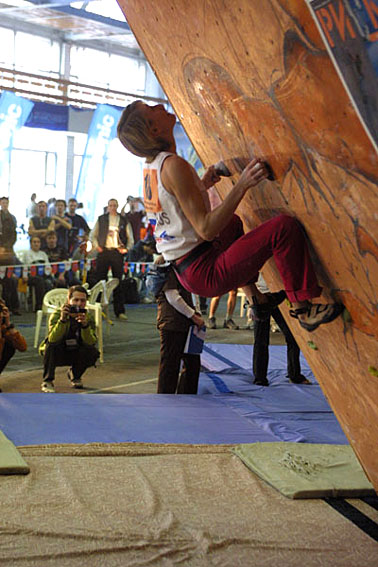 Стартуют девушки. Особенно интересно смотреть на француженок. Перед стартом они морально настраиваются, смотрят на стенку, злятся на нее, чуть ли не рычат. При срыве – гневные эмоциональные тирады на французском. К стенке они не подходят, они бросаются на нее. Более спокойна Сандрин Леве. Никаких бросков, лишних эмоций. Глядя на Сандрин, возникает ощущение бронепоезда на стене. Лезет она очень уверенно и пусть не столь артистично, как некоторые другие девушки, но видно, что сил здесь хватит на четверых. Россиянки явно не ударе. Юля Абрамчук, последней вышедшая в финал, обгоняет Ольгу Бибик, но, увы, здесь они соревнуются не друг с другом. В итоге первые пять мест не наши.