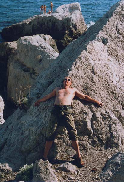 А впереди целых 12 дней или 288 часов, или 17280 минут, но лучше 1036800 секунд ничегонеделанья - снизошедшая мечта.... Так и понеслось: утром плотно завтракали, далее собирали рюкзаки и к скалам, где тусили прямо до вечера. (К слову говоря, наступление тёмного времени суток происходило здесь весьма скоротечно, словно кто-то просто выключал свет.) Далее спускались к морю и плескались нагишом (не все и не всегда)… пляж-то голый. Да! Так и называется "Голый пляж". Мне впервые довелось присутствовать на нудистском пляже. Сперва, правда, было как-то не по себе, но потом прошло.