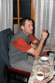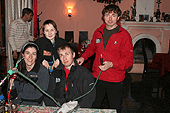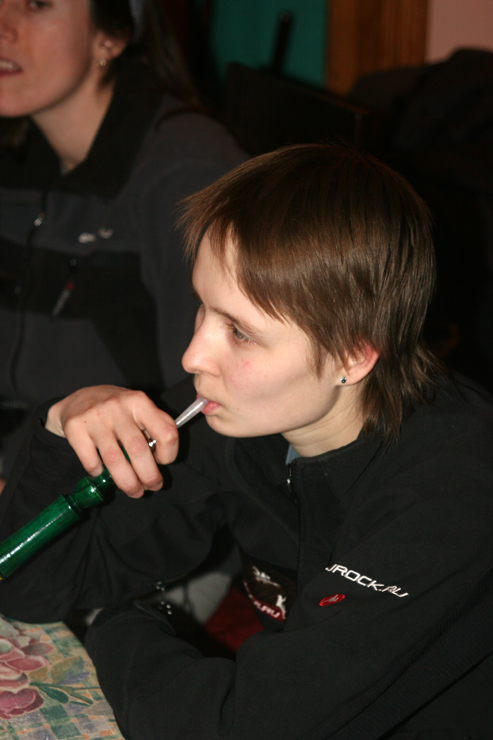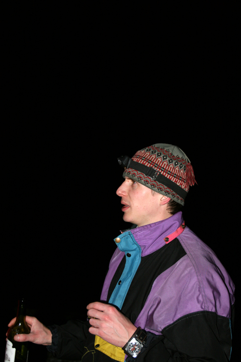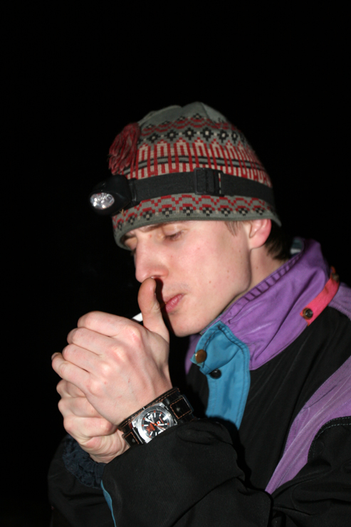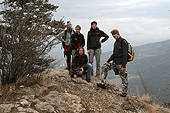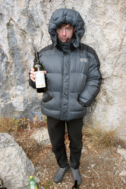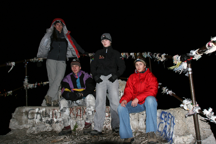 Утром следующего дня начались суровые скалолазные будни. Мы отлазили еще один день, попеременно то согреваясь, то дрожа от холода. Отметили пройденный день в Азры. На пике отмечания Шурик предложил сходить на Диву. Идея лезть ночью с фонариками по мокрой скользкой скале с сомнительными вырубленными ступенями и еще более сомнительными периллами была и впрямь увлекательной. Если прибавить к этому, что глинтвейн был конкретно усугублен массандрой, то сомнений не оставалось! Надо идти! В процессе наших сборов и переодеваний идеолог сего действа сладко уснул, мы решили не будить его, и отправились вшестером. На вершине наградой нам был ледяной ветер, но внизу нас ждали еще две бутылки массандры, так что жизнь продолжалась.