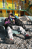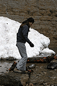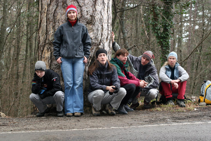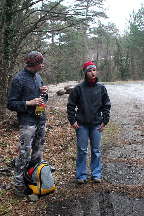 Всю ночь моросит мелкий дождичек. На окне водяные разводы. Видимо, в последний день погода все же решила нам подгадить на прощание, чтобы не расслаблялись. К 10 утра дождик вроде проходит, но влажно, зябко, выползать наружу не охота. Пьем чай в номере и ругаемся, куда пойдем. Лазить совершенно не хочется. Бррр! Уговариваем до последнего сопротивляющегося Шурика и едем гулять под Шаан-Каю. Дорога к Шаан-Кае, по рассказам очевидцев, ведет через замечательный хвойный лес. Очевидцы забыли добавить, что дорога зимой представляет собой грязевое месиво, радостно хлюпая и чавкая под подошвами, и наши и без того нелегкие ботинки через минут десять начинают весить по пять килограмм каждый. Ага, дыхалка. Тут как тут. Дышу, как выброшенная на берег рыба. Слабо отбрехиваюсь от Сережи, что, да, конечно, ну разумеется, в Москве я начну бегать. Плюю на гордость, пропускаю всех вперед и иду в своем темпе. Действительно, красивый хвойный лес. И жизнь хороша. Да пошли они нафиг со своим бегом!