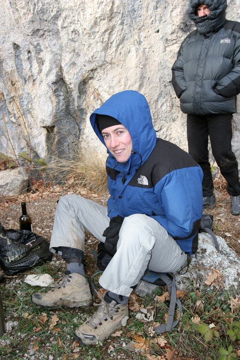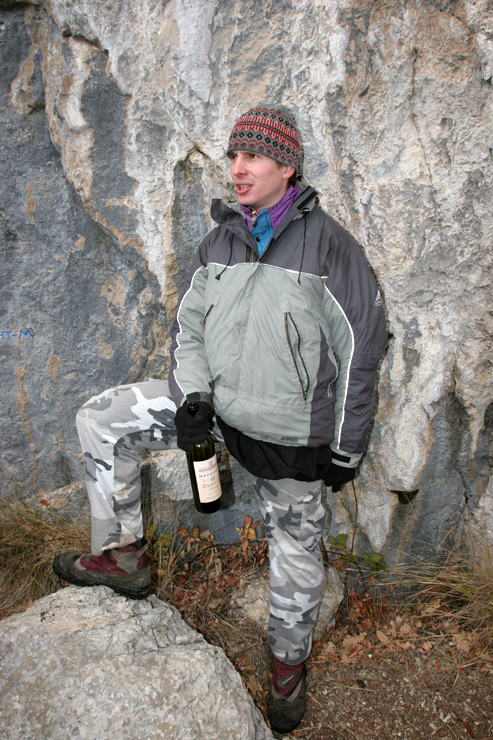 У Кошки было ветрено. И скалолазов, как грязи, что, в отличии от майских, радовало. Не одни мы такие идиоты. На холодные пальцы привычно запорола первую 6а (говорю «привычно» потому что в позапрошлый новый год при лазании в Сочи меня это дико изумило и огорчило), ко второй трассе пальцы стали горячими и пульсирующими, и можно было лазить. Лазание мало отличалось от летнего. Лезла я то в футболке, то в поларке, в зависимости от ощущений, но гортексовые штаны не снимала, что все же создавало ощущение определенной несвободы движений. К четвертой трассе пальцы опять начали замерзать и теперь не разогревались уже ничем: ни разминкой, ни убеждением, ни питьем горячего чая из термоса. И мы плавно перешли ко второй части программы – отмечанию Нового Года.