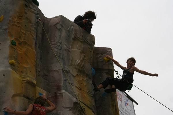 В один из моментов, нечто вывалилось из сумки фотографа, находившегося на самом верху скалодрома. Просвистев со скоростью примерно 500 баксов в секунду, грохнулось об помост и развалилось. Оказалось – новая фотовспышка. Хорошо, что соревнования в этот момент проходили на правой части скалодрома, а место слева было свободно и никого не зацепило. Инцидент исчерпали удачной шуткой, но знания остались, и, надеюсь, закрепились.