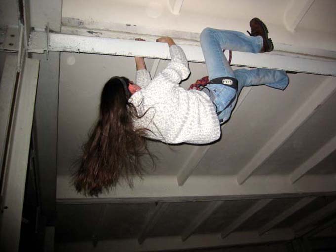 шатающейся доске, и лазанию вниз головой по пятиметровой потолочной балке.