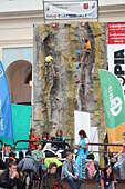 Рядом с амфитеатром был расположен скалодром «Walltopia», на котором были накручены две скоростные трассы для детского фестиваля. Такая рельефная стена, на ней яркие красивые зацепки. Колонки и DJ, сбоку столик, за которым находятся судьи. В общем, все, что нужно для настроения и проведения соревнований. Первые два дня проходили квалификация и финалы у младших групп.