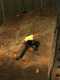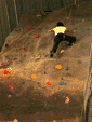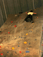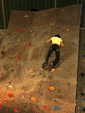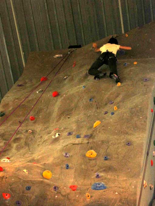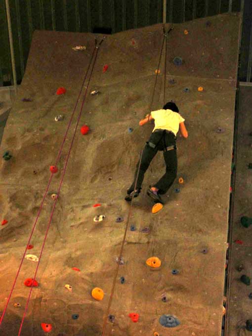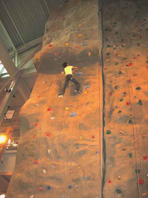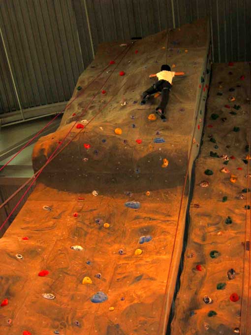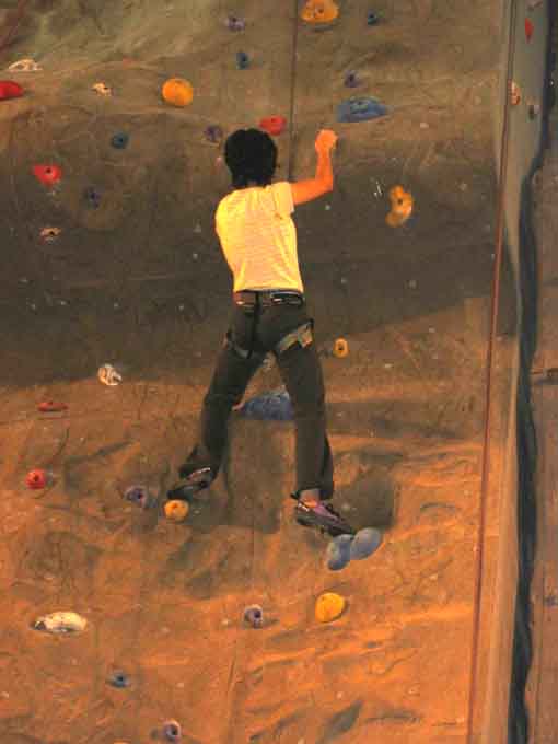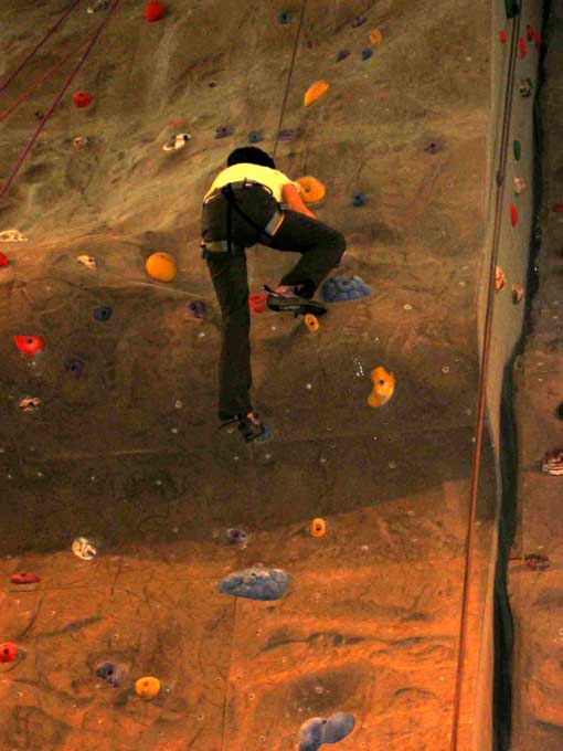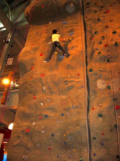 Я осторожно выбрал стенку 2. Вроде есть карниз и мизера, но не так сложно. Лена нервно выбирала между 2 и 3 и решила все-таки 2. Тебе надевают обвязку и привязывают веревку – самому нельзя. Лена полезла. Долезла до карниза, ручки устали и слезла вниз. Настала моя очередь. Тут Даник завопил: «Dad! I won’t let you go!» Почему – не знаю. Боится за меня. После долгих уговоров – отпустил. Дал Роме (папа Лены) фотоаппарат и полез. Ничего сложного. Техника – простые flaggings и backsteps. Карниз проскочил. Снизу страховщик говорит: «Nice!» – высшая похвала местных скалолазов. А чего «nice»? На скалодроме посложнее было. Долез доверху. Там кнопка. Нажал – на весь магазин грянули фанфары. Народ внизу рукоплещет.