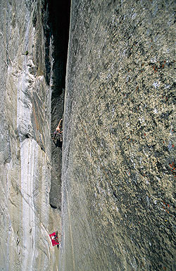 Я начал лезть, распираясь в узком внутреннем углу без трещины в основании. Немного зацепок под ноги на гладком граните не оставляли мне другого выбора, кроме как подниматься, упираясь спиной во внешнюю сторону угла, а ногами - в поверхность стены, испытывая на пределе качество резины на моих туфлях. Я чувствовал напряжение в спине, пальцах и шее, и когда угол начал подвисать, в нем появилась достаточно большая для пальцев трещина. Зацеп под ноги не было, и приходилось продолжать лезть, не снижая темп. Трещина закончилась, и я выдавился направо к покатой полочке, а с нее задинамил в небольшое расширение в щели, где можно подклинить пальцы. Я уже забился, и меня явно трясло. Я даже не слышал, как меня до хрипоты поддерживали Бэт и Адам. Уже на пределе своих возможностей я подошел к следующему ключу; распираясь большими пальцами в маленький потолок я стал тянуться к подхвату высоко над головой. Когда я достал его, то почувствовал, что у меня начинает кружиться голова. Я с трудом дотянулся до мизеров еще выше и выкатил на плиту. Мои ноги тряслись, а в голове был ураган мыслей. Еще три метра, и все будет сделано, сказал я себе. Мне удалось сконцентрироваться, собраться и аккуратно перейти траверсом по микро-зацепам к станции на полке.