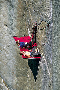 Я почувствовал огромное облегчение, и поблагодарил годы, посвященные спортивному скалолазанию за выносливость, которая здорово помогла на этом участке. Я смог пролезть чисто ключ маршрута. Но впереди было еще чертовски много тяжелого лазания. Бэт и Адам зажумарили ко мне, и мы повесили платформу, так что я мог отдохнуть. Адам начал рассказывать о предстоящей поездке на Аляску. "Может, если я куплю себе медвежью шкуру и завернусь в нее, то медведь примет меня за своего и не станет есть меня?". С озадаченным выражением лица он продолжал: "Я только надеюсь, что гризли-самец не примет меня за самку". Бэт рассмеялась. Мое напряжение быстро растворялось. Подбирая железо для следующей веревки, я постарался забыть о картине, которую навеял рассказ Адама, и сконцентрироваться на предстоящем лазании.