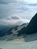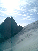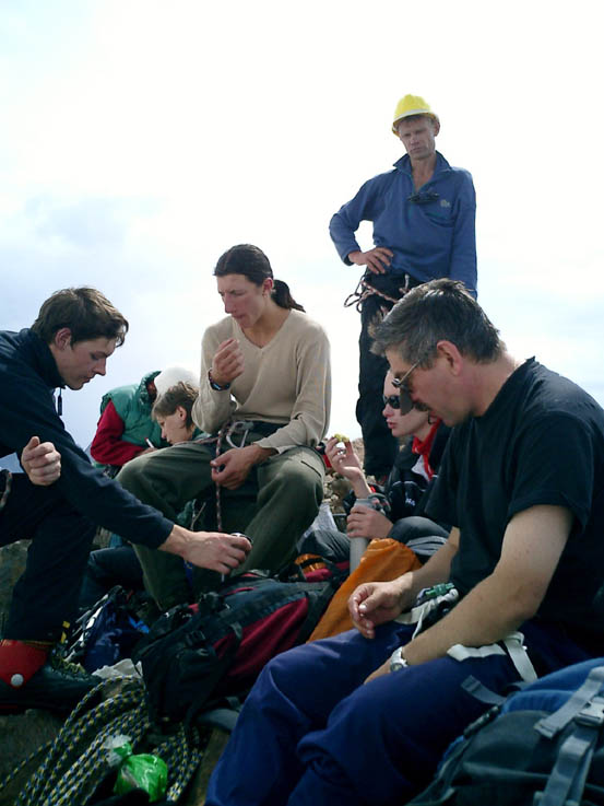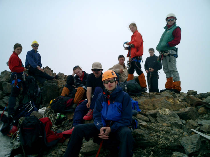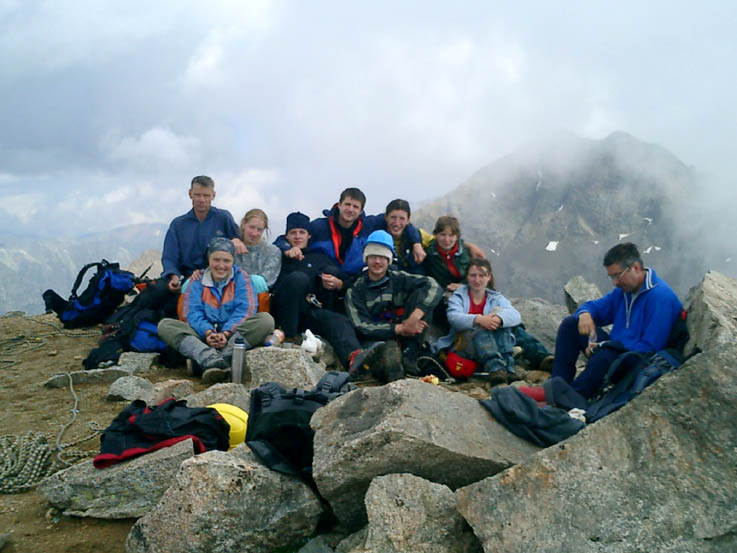 И посыпались мы вниз. Для затравки народа, Слава Бакуров, хочу отдать должное его чувству юмора, предложил сбегать на соседнюю вершину. Конечно, он не знал, что так шутить в присутствии больных людей нельзя. Услышав эти слова, мы с Артуром (напомню, мы были в одной связке), не теряя ни минуты, наперегонки, спотыкаясь и путаясь в веревке, совершенно забыв про то, что в нашей связке еще и Саша, бросились на спуск. До склона, который нависал над трещиной мы, как мне показалось, добежали в два прыжка, получив по прибытию пару подзатыльников (словестных..=) от Саши, в знак одобрения скорости нашего передвижения, что было, впрочем совершенно справедливо. Тут мы столкнулись с ребятками из параллельного отделения, которые неторопливо спускались вниз. Обойдя их левее, связка Михаил-Дима-Настя спустились первыми вниз, к трещине, а за ними и мы. Стоя на страховке на склоне около трещины, я вдруг заметил, как мимо меня, сорвавшись, в полной тишине, в сторону трещины проехала Валя. Слегка давя на ледоруб и кокетливо глядя по сторонам она пыталась зарубиться. Народ, видя эту картину, в ужасе застыл. Зарубиться Вале удалось в нескольких метрах от трещины, даже скорее не зарубиться, а зацепиться за снег. Публика облегченно вздохнула.
