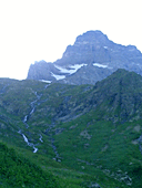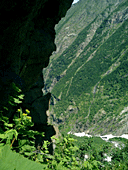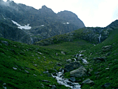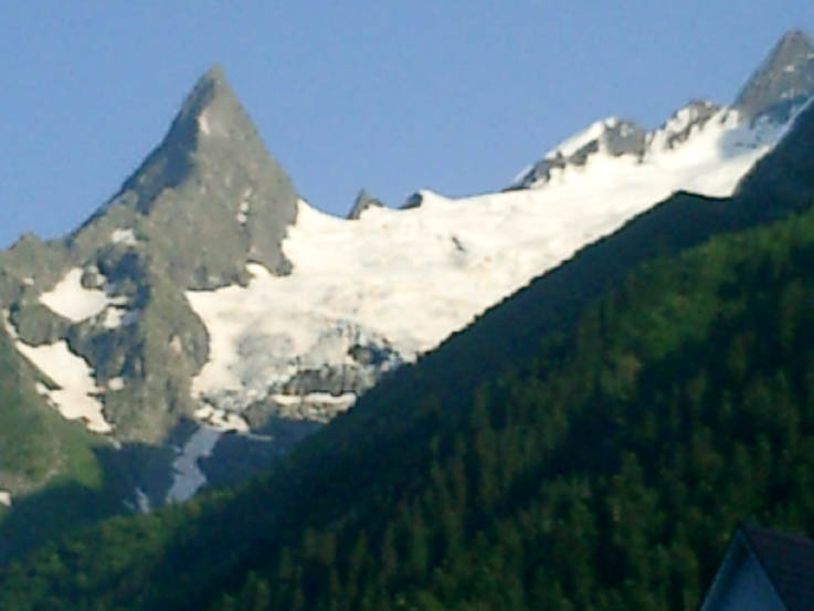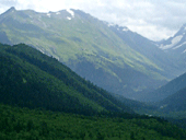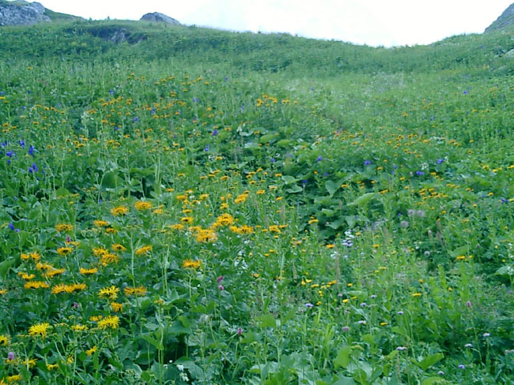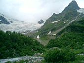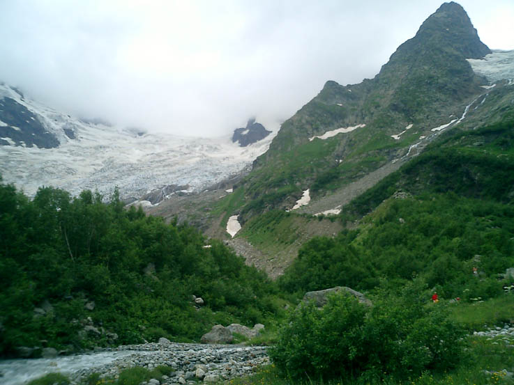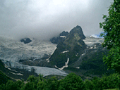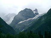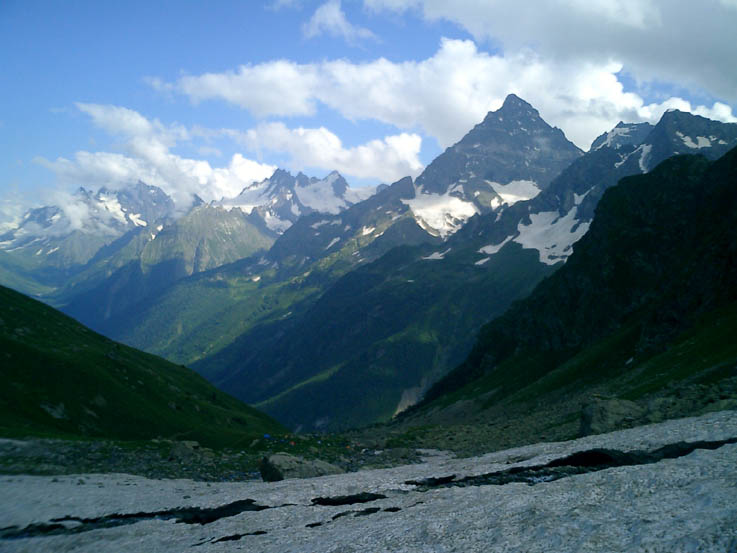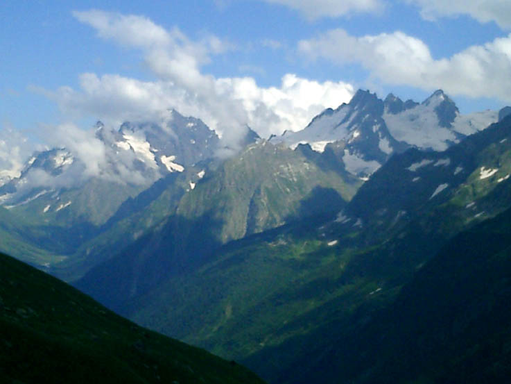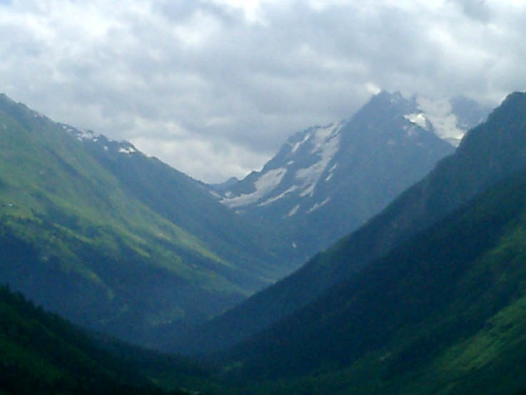 Пошли. Потихоньку-полегоньку…Опа…- немного кружится голова с непривычки, да и бежать что-то уже никуда не хочется… Не представляю как мне могла придти в голову идея отправить девчонок на машине, а самим идти пешком с рюкзаками, видимо был болен. Пыхтя и потея, хотя по высоте от Домбая до Алибека набрали метров 300-400, мы продвигаемся по тропе. Переодически закладывает уши, но в целом я чувствую себя вполне нормально и даже успеваю сделать несколько снимков окружающих красот. Справедливости ради надо отметить, что в конце Сбора этот переход Алибек-Турье, казался нам просто детской разминкой, подъем с рюкзаками занимал у нас минут 30, а спустились мы как-то вообще минут за 15-20.