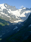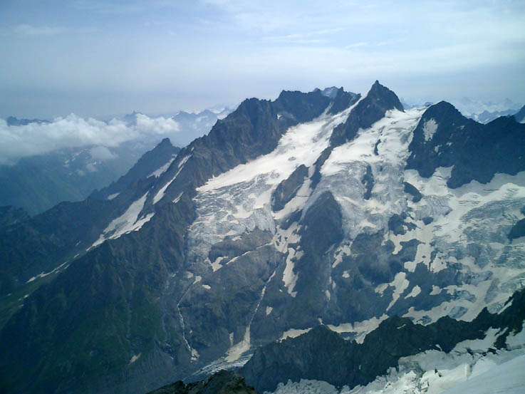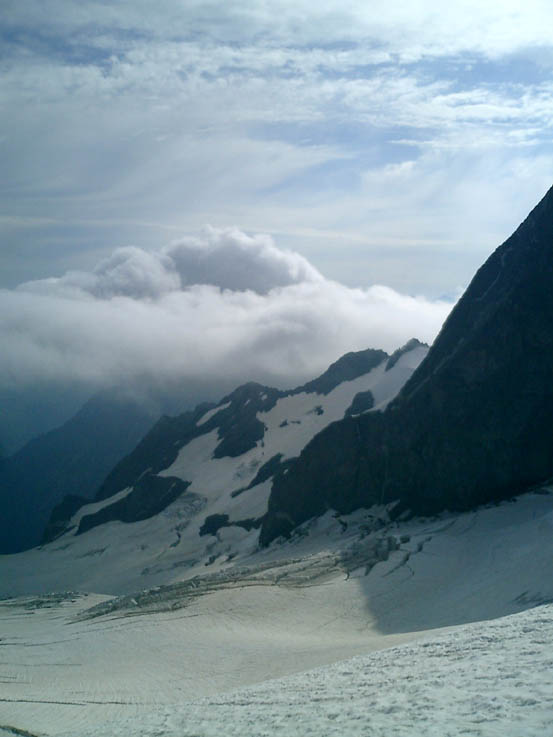 Ну значится стали мы топтать этот снежник. Влево-вправо. Влево-вправо. Кой-кому из моих коллег от этого было так же не по себе. Товарищей этих было легко узнать, так как снег вокруг них был немного оплавлен от искр, которые летели из-под их копыт в разные стороны. Вылезли мы снежник и оказались на склоне, внизу которого, метрах в 100 лежал ледник, кстати, с трещинами. Сверху эти трещины показались мне просто игрушечными…ну об этом позже. Предстояло преодолеть траверсом этот склон. Связавшись в тройки (двойки) народ неспешно начал движение. Хотя отдельные товарищи и кстати я (который помнил о том, что к вечеру должен стать круче Месснера) в их числе, побежали вприпрыжку, щегольски похлопывая себя ледорубом по ноге. Товарищи даже не замечали, что на другом конце веревки у них кто-то болтается, судоржно пытаясь в это время со снега подняться. Так и пропрыгали весь склон. Слава богу, что склон был с мягким летним снегом, а не с, например жестким фирном. Урок мог бы закончиться, так и не начавшись. Далее мы разделились на две группы и одни отправились заниматься прямо и вверх по склону, другие же (те кто был в тройках) пошли немного правее. Не буду вдаваться в техническую часть вопроса, но для себя я понял, что сверхсложного здесь ничего нет, надо просто внимательно, спокойно и собрано выполнять определенный набор действий, а уж доведутся эти действия до автоматизма только когда будет опыт. Не все сразу.