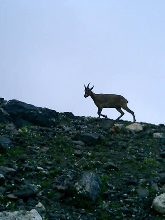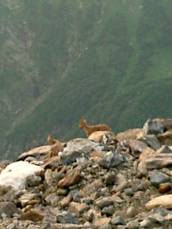 Во второй половине дня мы вышли на снежные занятия, которые проходили по адресу: Домбай - Алибекский ледник – Правый Склон, выше морены. Дорога туда была ознаменована знакомством, собственно, с самим озером Турьим. Озеро Турье – Высокогорное ледниковое озеро с водой бирюзового цвета. Купаться можно, проверено. Мин нет. Зато есть горные Козлы, которые туда периодически приходят на водопой. Нудистский пляж находится прямо по центру озера, практически рядом с тропой, за уступом. Более скромные дамы купались несколько правей, тоже, кстати, рядом с тропой, уходящей наверх, к Вершинам Джаловчат и пику Раздельный, правда, надо отдать им должное, открыли нудистский пляж именно они.
