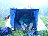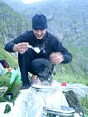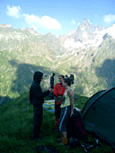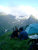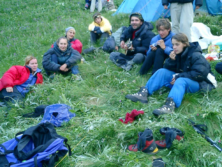 Спуск доставил массу удовольствия, заставив на время забыть Горе. Больше ничем примечательным, как мне показалось, спуск отмечен не был. Уже на подходах к лагерю, народ почуял близость озера и, забыв про все на свете, ломанулся вниз как очумелый. Смыв с себя горечь поражения, ободренные близостью еды и…еще раз еды (хоть и было ее мало) мы отправились в лагерь. Ну а в лагере, что было приятно, нас встретила Галина с полным котлом чая, который мы выхлебали, даже, по-моему, не успев понять что это такое. В свою очередь и мы вспомнили про Правила Хорошего Тона на Горе, и нечеловеческим усилием воли отставив кружки в сторону, пошли ставить воду для спускающихся ребят.