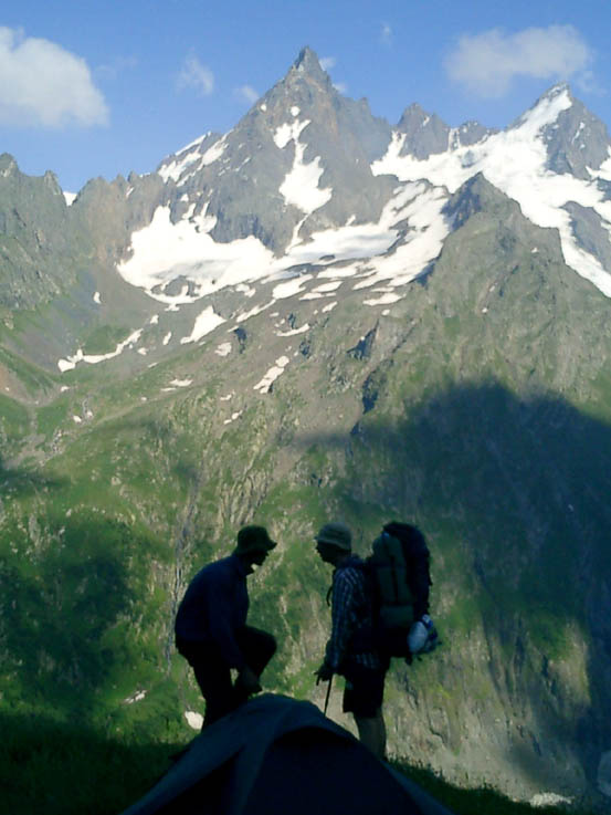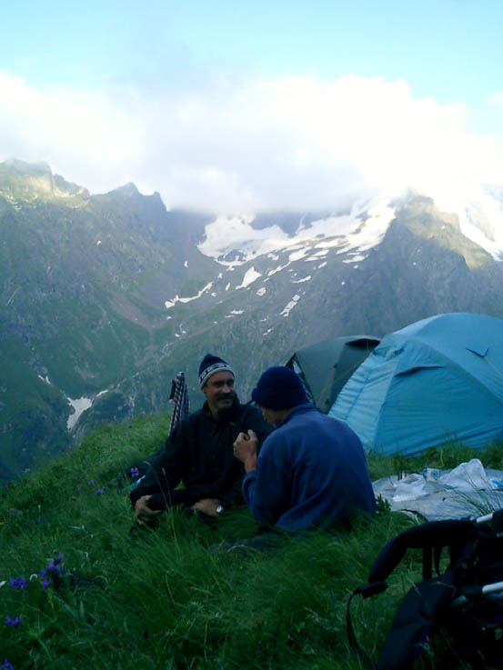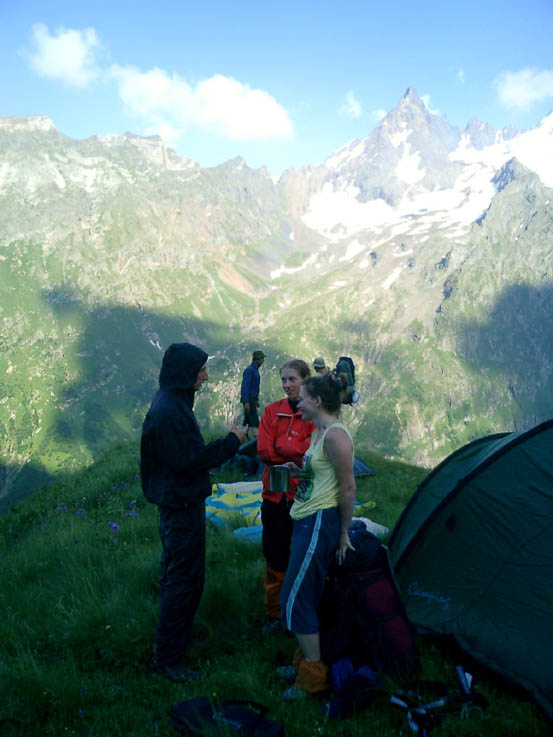 Выпить не удалось, да и особо не хотелось. Вроде как полдня шел дождь, ну и в связи с этим мы занимались всякой всячиной. Помню, даже полезное дело сделали: склеили из 3х кусков полиэтилена прекрасный тент (спасибо конструктору Михаилу и Лехе), который на протяжении всего сбора укрывал наши головы на кухне от дождика, которого, надо отметить, Домбай для нас не жалел. Погуляли по окрестностям с девчонками. Разведали где можно будет помыться и, О Счастье! – поплавать. Есть даже бассейн. Не зря вопрос с тапками меня так мучил дома.