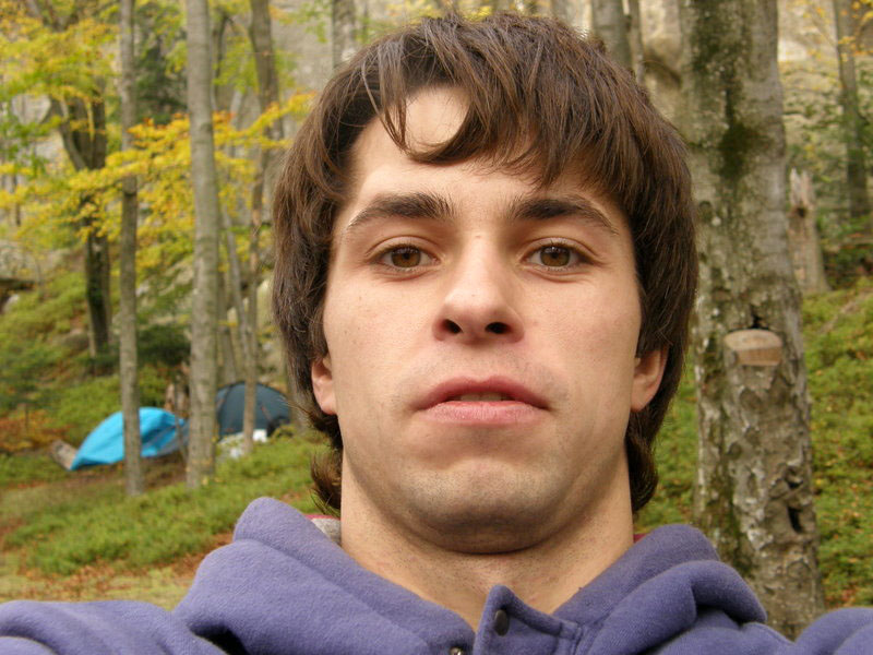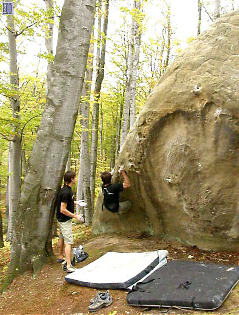 Мимо проходил Миха Шалагин и показал нам направление, в котором можно было найти забавную 7B+-7C на три перехвата, и мы, конечно, устремились к ней. Самое сложное в проблеме Камяный Баклажан - это оторвать зад от мата и сделать первый перехват. Из нас троих это удалось только Железной_голове, он в красивом маевском стиле сделал первый перехват и пролез всю трассу целиком. Нам не хватило техники, и мы залезли простой вариант 6С. После непродолжительного трекинга мы оказались у подножия Реберце, это траверс 7С, впервые показанный вам PP в его замечательном видео отчете об их роктрипе с Вано и Мишаней. Поэтому особо утомлять вас не буду рассказами про дырки под один палец и плохие пассивы, скажу только что ему мы посвятили очень много времени, но так и не победили, не помог нам даже маевский стиль. Пашка, правда, падал два раза из под финиша, ну в общем нам надоело лазить эту сложную 6 B + и перешли на следующий блок. А назывался он Богданович, это очень интересная 6С+ из четырех перехватов, на ней мы сломали почти все зацепки под левую руку, за это нам очень стыдно, просто Vovchila очень толстый. Следует сказать об одной особенности этого скального варвара: он во время результативного прохождения боулдеринга обычно ломает ногами ключевые зацепки, дабы уменьшить количество повторов этого боулдеринга. Этим мы и пользовались в следующий день фестиваля.