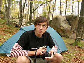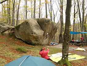 Дорога в Автобусе прошла скучно, все тупо ехали и песням Vovchila-Мелочь_есть никто не подпевал, а мы вообще с начала поездки настаивали на его молчании. Короче, оказались через пару часов мы в волшебном лесу, идем такие красивые по тропе за организаторами к месту пьянки, в смысле стоянки, а вокруг камней дивных тьма. Естественно, начали мы бегать от одного к другому, зацепки щупать, категории понижать. В общем до стоянке дольше всех перлись, пришли, пожрали вафель с кока-колой, и пошли 6 B обкатывать.