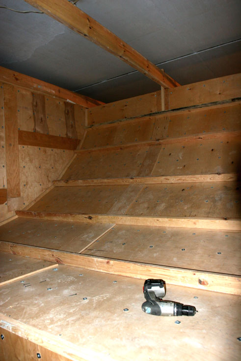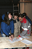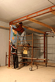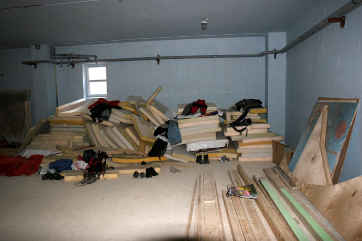 Мы не спеша обходили помещение. «Вот здесь будет потолок. Шесть на шесть метров потолочного лазания. Надо будет – еще зашьем. Вообще, пятьсот метров это без этих двух стенок. Если еще и их зашить, то раза в два больше получится. Но это и так будет самый крупный боулдеринговый зал из всех имеющихся на данный момент, так что… Вот здесь будет раздевалка и душ. Это наш отдельный вход, не через школу». Вернулись к верстаку, на котором среди инструментов, банки кофе и прочих необходимых строительных принадлежностей, лежали скрепленные чертежи с макетом скалодрома. «А ты успеешь к июню?», - поинтересовалась я. «Сдача проекта – 15 мая. Надеюсь к этому сроку и успеть. Пока идем по графику». «А кто строит?», снова поинтересовалась я. «Кого поймаем, тот и строит:). Вот у вас в форуме писал, что нужны помощники. Костя ( orange) приехал, спасибо. Если еще кто созреет, будем очень благодарны!!! Нужны не просто «помощники», а люди с головой, чтобы не бегать за каждым, не объяснять, как гвоздь забить. Простых подсобников найти нетрудно, нужно, чтобы человек хоть какой-то опыт работы имел. Денег на сами стенды кое-как наскребли, а с волонтерами можем расплачиваться только бесплатными тренировками…».