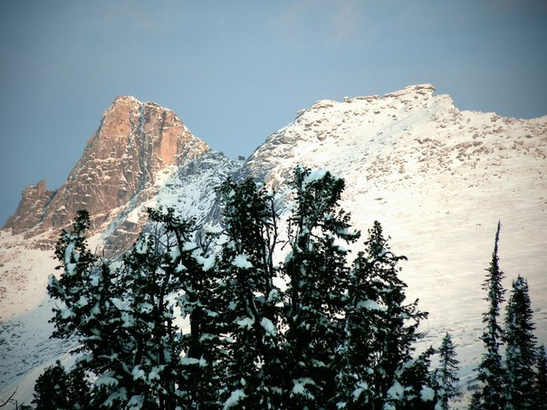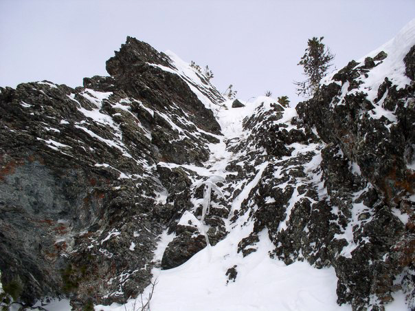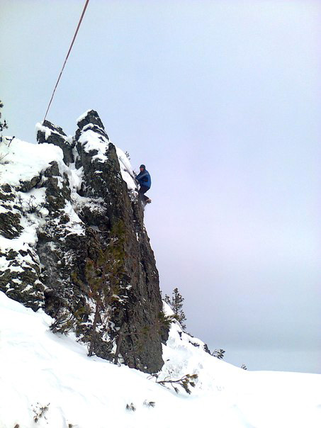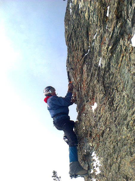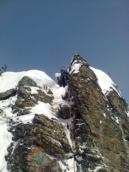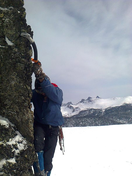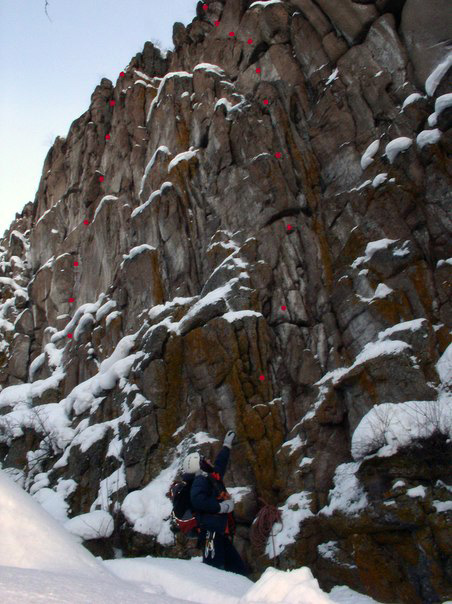Полазив в Красноярске придумали оборудовать в Ергаках несложный реально проходимый часа за три четыре длинный DT маршрут на ближнюю вершину - Голову Спящего Саяна. Маршрут «по Уху справа» оборудовали в августе 012, получилось зимнее скалолазное приключение для ВСЕХ c короткими участками D5-D6 и с возможностью наблюдать героев из окна кафе в сильный бинокль или трубу. Видимость по прямой, из кафе горнолыжки «Снежная» до маршрута, километров 10. Особо отмечу что по замыслу, маршрут проходится без дополнительного страховочного снаряжения. Без крюконог, скайхуков, и ИТО технологий. В зависимости от опыта допускается в качестве подстраховки взять на маршрут 2-3 мелких и средних френды. Приветсвуется свободное лазание в кошках. В быстром темпе молотки в руках без самостраховок. Обратить внимание на заточку клювов !!! заточенные в иголку клювы не есть то что требуется для скал. Страховка на маршруте через установленные надёжные точки, клиновые анкера, кованные 100 мм «Mungo» станций нет. Треть установленных точек одинарные уши с кольцами или рапидами. В монолитном, горизонтально сжатом граните одного такого для спуска будет достаточно.
