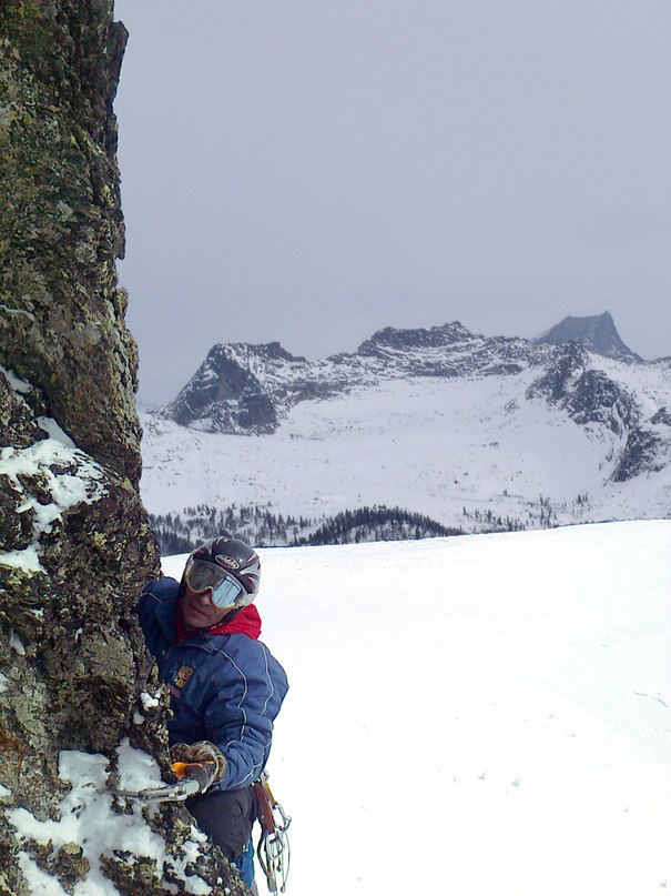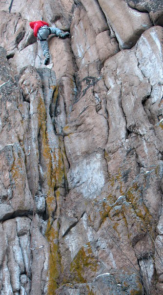 Есть особенность и необычность лазания по круглым гранитным щелям с использованием молотков. Нет дырок, и активных 100% хватов на рельефе. Активных ног мало, круглые полочки под передние зубья кошек. Есть распоры и мёрзлая земля, лёд в щелях. Много снега который срубается молотком, сыпется на тебя, за шиворот под очки в глаза. Первому нужна продуманная экипировка. Не помешает потренироваться лазать с молотками по щелеватым заснеженным гранитам на Столбах.