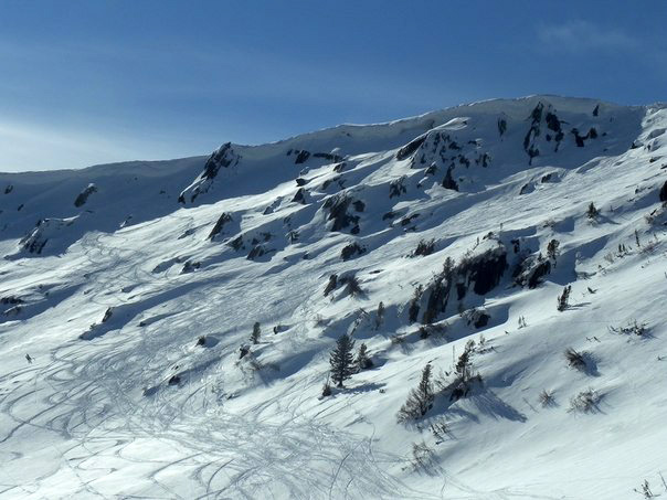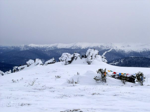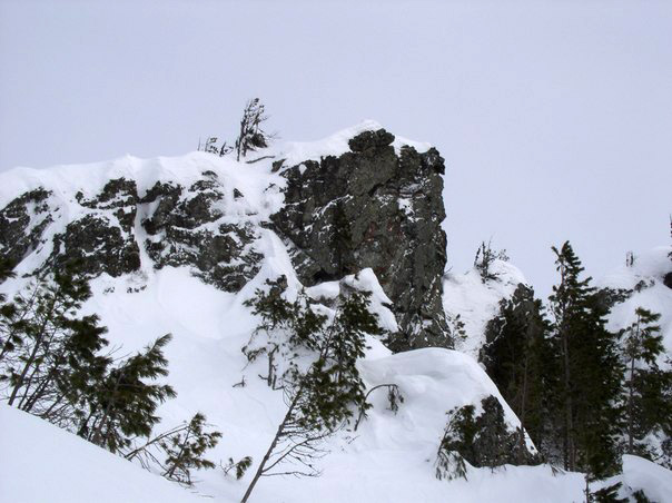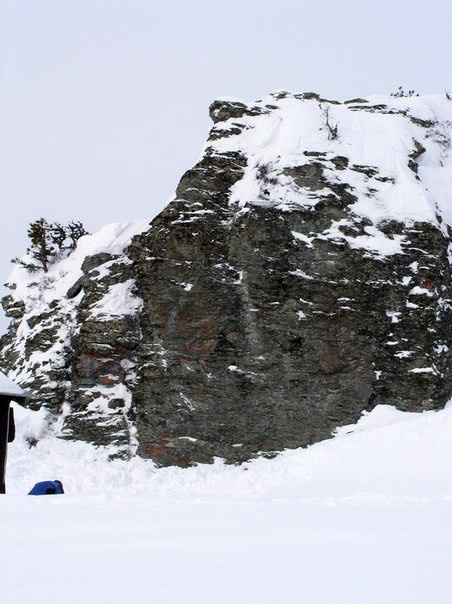 Попытка пройти маршрут по "Уху справа" в начале марта не удалась. Помешала стихия - очень сильные снегопады, пурга, глубокий свежий снег и почти нулевая видимость. Попытку отложили на апрель, зато провели разведку ближних скал. Скалы на Юго-Восточном гребне г/б Ергаки. От багажника машины до скал неспешно идётся за 20-25 минут. 10 минут на подъёмнике и 10-15 пешком по гребню. Высота скал 15-25 метров крепкого необычного рельефа для любого уровня лазания. Лазать можно до 7-8 метров и прыгать вниз. Внизу под скалами глубокий снег. В один день можно за три часа улазиться на скалах, отдохнуть в тёплом кафе и тут же укататься на горке. В четверг на горнолыжке «Ергаки» цены пополам. Самое комфортное время для поездки полазать - покататься начало ноября - середина декабря, март, апрель.