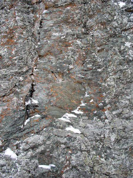 О маршруте. На фотографии хорошо видна линия маршрута. Начало длинная метров 120 узкая местами неудобная полка. Полка упирается в наклонную градусов 60-70- плиту с щелями и лбами метров 60, везде встречаются круглые щели забитые землёй, гравием, лазание по щелям в распор на этом участке установлено штук 7 анкеров. Это ключ. Дальше маршрут ложится до 50 градусов. Лазание по замёрзшему дёрну щелям и полкам. Общее количество установленных анкеров на маршрут длинной примерно 300 метров -17.