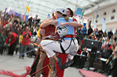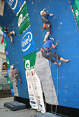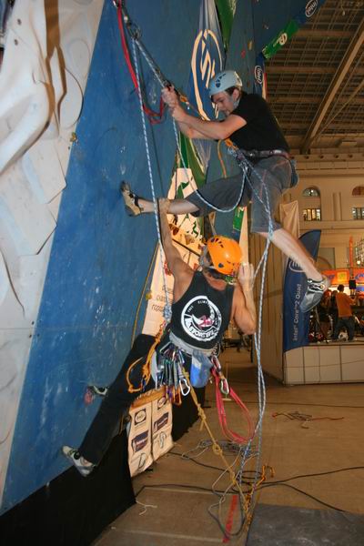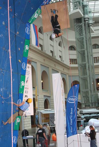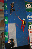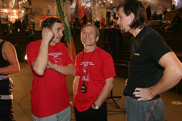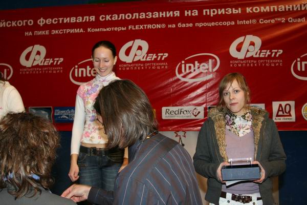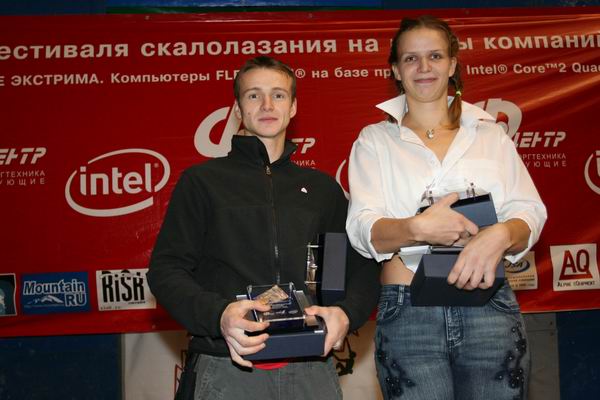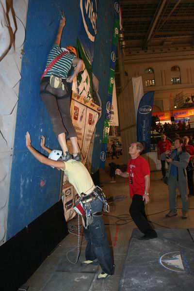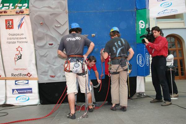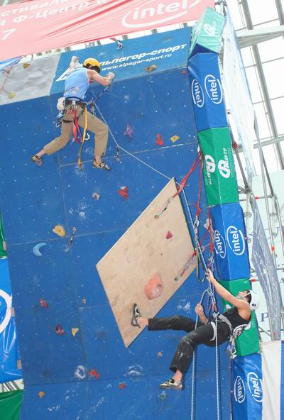 Третье, что вызвало большой интерес зрителей и телевизионных камер - выступление связки Алексей Чертов / Дмитрий Бычков. Лично меня решение выступить Старшего тренера сборной России по скалолазанию и Президента ФСР заставило поволноваться: а что, если «боссы» отечественно скалолазания «не пролезут». Стыд – позор – народные волнения. Но, как оказалось, пороху у руководителей хватило не только, что бы выступить удивительно технично и грамотно, но и, что бы занять второе место. Так что один из оригинальных призов, подготовленных компаниями Intel и Ф-Центр к Финалу Российского Фестиваля скалолазания, займёт почётное место в офисе ФСР.