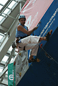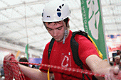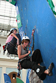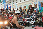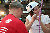 Второе, что три дня вызывало восхищение зрителей и трепет участников – мастерство подготовщиков трасс. В индивидуальном лазании старались Олег Черешнев – Алексей Чертов. В связках «сделали красиво» Александр Ласточкин - Виктор Гуляев – Михаил Пекарев. Даже не просто красиво – скорее изыскано. Причём, слово «связки» в квалификации было трактовано буквально. Стартовали участники связанными по рукам - ногам, и первый траверс на радость зрителям совершали в таком забавном виде. Дальше - больше. Им необходимо было закрепиться на первой станции, стоя друг на друге. Потом пролезть сложный маршрут, сделать обоим впечатляющий маятник спуститься на землю в заданную точку.