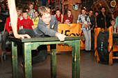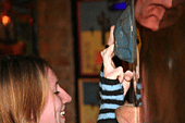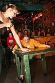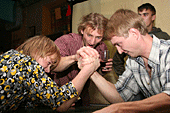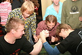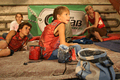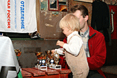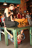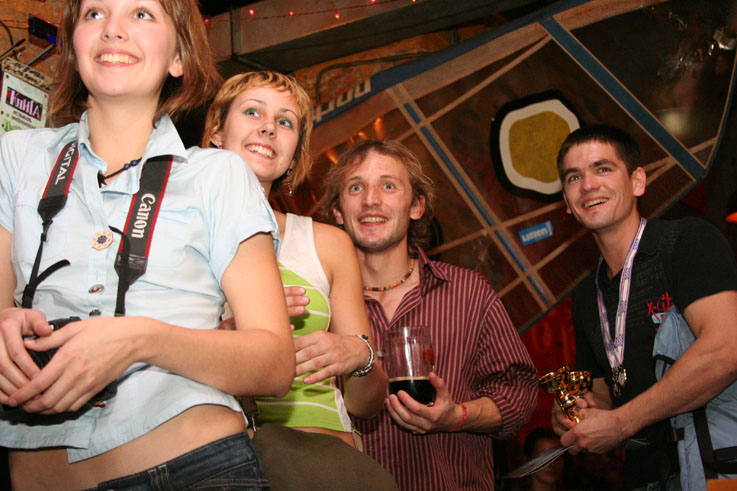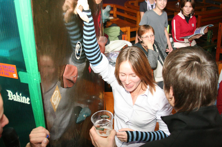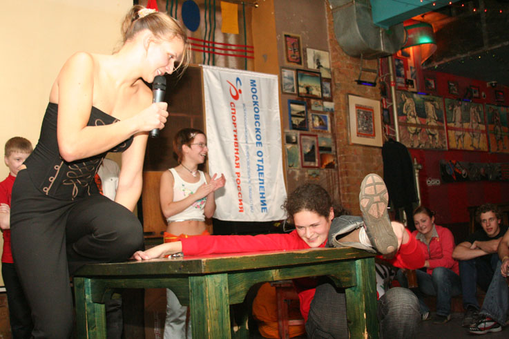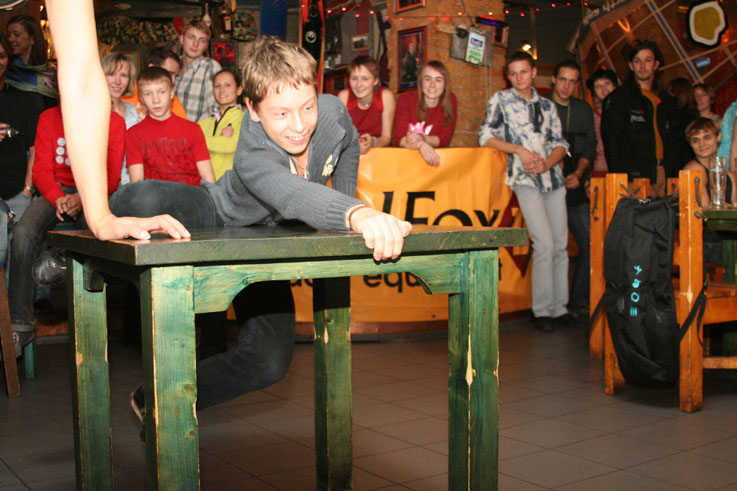 Наглядевшись на кубки и призы от партнёров соревнований, скалолазы стали расходится, не в смысле уходить, а смысле широко гулять и проявлять молодедскую удаль. Нормальные гуляки на столах танцуют или спят под ними, скалолазы под столами лазают. От детей желающих пролезть подстольный «потолок» не касаясь пола, не было отбоя. В конце концов, Анна Ракитская утвердилась на столе в позе русалочки и увлечённо комментировала происходящее, все остальные давали детям советы, куда ставить ноги, за что держаться и как распираться. Как и следовало ожидать, одного стола для определения победителей оказалось мало. Да и двух тоже. Как у ребяток силы остались после фестиваля – вопрос открыт.