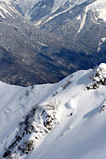 Тот счастья не видал, кто в “Домбае” не бывал. Красоту этих мест можно описывать бесконечно долго. Лесистые склоны, подпирающие снежные вершины и бурные реки, заполненные кристально чистой водой, мало кого оставляют равнодушным. До недавних времен это ущелье являлось подобием Мекки и собирало толпы альпинистов, горнолыжников и просто туристов практически круглый год. Расположено оно в трех часах езды от аэропорта г. Минеральные воды и добраться до него можно практически круглые сутки на маршрутном транспорте или такси. Стоимость автопробега до Домбая не превышает эквивалент 20 американских рублей, это в случае если вы путешествуете в компании друзей и можете разделить финансовое бремя на шару. В одиночку проделать этот путь так же несложно, просто придется платить за такси в одно лицо. Но этого всегда можно избежать, так как в зимний сезон найти себе компанию из таких же как ты, увлеченных зимними забавами людей, очень легко. Единственное чего стоит опасаться, преодолевая промежуточный пункт, аэропорт – атак цыганских ведуний, которых здесь бывает много. Боятся их не надо. Нужно просто быть повнимательней со своим багажом. Заслуживает внимания еще один момент, с которым сталкиваешься каждый раз по прилету в аэропорт Минеральные воды. Это борьба таксистов за клиентов у стойки получения багажа. В целом это не отличается от картины любого аэропорта страны. Просто здесь она имеет яркий национальный колорит и порой напоминает шум азиатского рынка. По приезду в Домбай Вы имеете возможность выбирать варианты размещения в достаточно широком ценовом и, соответственно, эстетическом диапазоне от 7 до 100 $ за сутки. В настоящее время на Домбайской поляне работает целый туристский комплекс из 17 гостиниц. Но любители дикого отдыха могут пользоваться при размещении услугами частных владельцев жилья. Объявления, предлагающие такой вид проживания, размещены по всему поселку в местах организованной торговли и питания. К стати о питании. Готовьтесь к мясной атаке, любители вкусно поесть. Баранина в различном исполнении, хычины и шурпа – основно меню местной кухни. Что касаемо основного вопроса – катания. Начнем с канатки. Здесь действует 5 очередей канатно-кресельных дорог, маятниково-канатная дорога, сеть бугельно-буксировачных дорог (длиной 200-600 метров). Общий перепад трасс по вертикали достигает полутора километров. Спуск с вершины хребта Мусса-Ачитара, который имеет отметку 3012 метров над уровнем моря, можно осуществить по десятку вариантов трасс различной степени крутизны и сложности, что позволяет удовлетворить вкусы и опытных и начинающих райдеров. День катания по стоимости может вылиться в сумму порядка пятисот – шестисот рублей России.