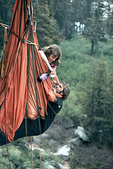 Harding и Beryl Knaut демонстрируют преимущества «Bat Tent», спроектированной в 1969-м году Roger Derryberry для «висячих» ночевок и использованной Harding’ом во время первопрохождения the South Face of Half Dome и the Wall of Early Morning Light. Фото: Roger Derryberry