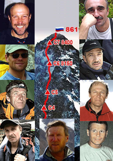 Один к одному, девять альпинистов, "удержавших" С6 и С7 вчера и встретившихся сегодня. Слева, сверху вниз: Виктор Володин, Виталий Горелик, Евгений Виноградский и Глеб Соколов. По середине: Павел Шабалин. Справа (сверху вниз): Геннадий Кириевский, Ильяс Тухватулин, Ник Тотмянин и Алексей Болотов.