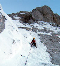 Идти вдоль волнообразного гребня на восток, затем спускаться на север к Forcella Mose, сначала по гребню, а потом, когда он закончится, вниз по снежному желобу. С седловины спуск по желобу (1 час). Можно сдюльферять после трудной части маршрута. Есть 4 стационарные точки. |