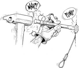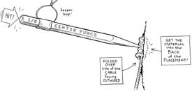При установке хеда следите за тросиком, чтобы не перебить его молотком. Хотя стандартный метод – это поставить крестик «Х» на головке хеда при помощи пол-дюймового плоского зубила (не забудьте закруглить острие зубила, а то расколите головку на части), я предпочитаю использовать точечное зубило с круглым бойком 1/8 дюйма (посвященные поклонники ИТО берут собой набор различных плоских и точечных зубил).