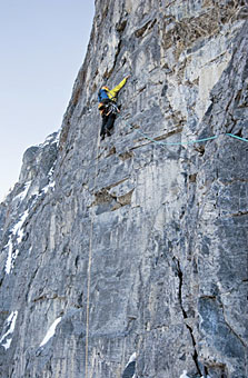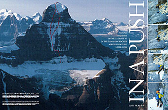 Chris Brazeau проходит онсайтом ключевой участок (5.11b). Это первое "чистое", однодневное прохождение маршрута категории 6 в Скалистых горах. Также это первое восхождение по северной стене Alberta за почти десять лет. Автор: John Walsh |