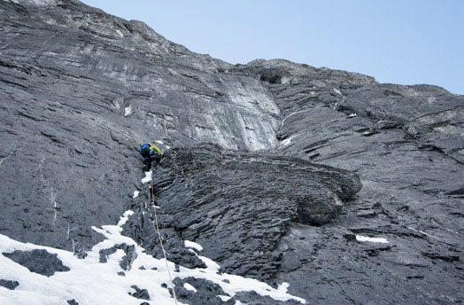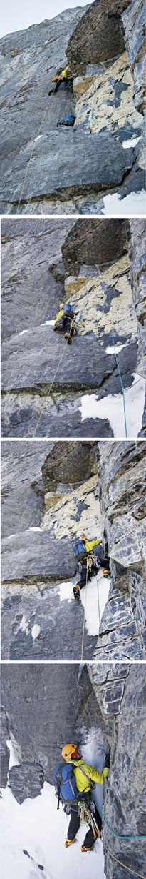 Было 9.45; мы наконец-то стали укладываться в составленный план движения и попеременно лидировали, двигаясь в неизвестность. Крису достался первый питч: деликатное микстовое лазание по внутреннему углу, залитому натечным льдом, к небольшой станции. После настала моя очередь, и я обработал снежный участок выше станции. После того как угол закончился, и стена стала нависать, я прорубил снежный карниз и ушел траверсом футов на 20. К счастью, трещина, начинавшаяся после угла, позволила мне добраться до небольшой полки, на которой я соорудил станцию на крюках и закладках.