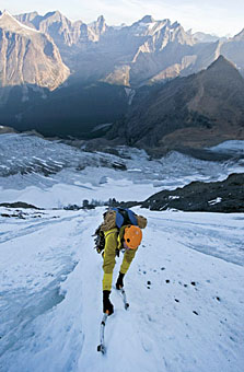 Мы прошли 13 километров за 7 часов, перейдя вброд ледяную реку Sunwapta, и до полуночи дремали в хижине Mt. Alberta. Час спустя мы уже пробирались по освещенному лунным светом леднику к основанию северо-восточного ребра. Было 3 часа утра. Черная громада северной стены полностью закрывала луну. Мы находились на большом обледенелом «балконе» с которого я дюльферял вниз три года назад. Как и George Lowe и Jock Glidden до нас, мы не могли найти оптимальный путь на лежавший внизу ледник.