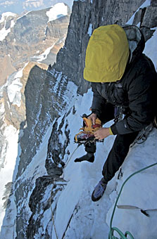 В наши дни все больше восхождений подтверждают мысли, что «чем быстрее, тем безопасней» и «лучше меньше, да лучше». Мы несли с собой самый минимум необходимый для нашего «однодневного» восхождения: снаряжение для скал и льда, пуховые куртки, маленькую горелку, котелок, газ и продукты. Пока у тебя достаточно энергетического геля, а в фонаре свежие батарейки, необходимо двигаться вперед, дабы все это не закончилось прежде, чем маршрут будет пройден. Я называю это «марафонским лазанием». Если хочется отдохнуть, перебори себя, двигайся вперед при свете фонаря, кричи, если нужно, и все будет, так как надо. Это вопрос опыта, и не приходит после одного восхождения.
