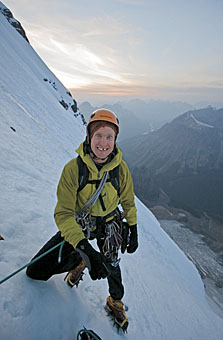 Brazeau в экстазе после прохождения последнего питча бастиона. Все что им осталось это три ледовых питча п окуполу, выход на ребро и весьма сомнительный спуск по японскому маршруту (V 5.6). Очень плохо что они не изучили спусковой маршрут дома ... Фото Jon Walsh |