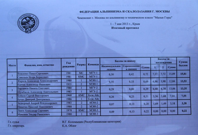 Связка Каячев – Жарков 1-й маршрут «Мачомбо» на Морчеке прошли за 10 часов, а в последний день заявили «Центр» на Форосском канте не с самым высоким рейтингом. Их соперники Варламов Никита и Шумбасов Александр прошли маршрут «Мачомбо» за 11 часов и маршрут «Гиперборея» на Шаан-Кае за 13,45 часа. После этапа «Школа» у энергетов был запас 0,4 балла и учитывая, что скорость прохождения маршрута по действующей в этом году формуле имела весомое значение, им нужно было завершить восхождение до 17.00. (контрольное время в 3-й день восхождений – 18.00). С этой задачей два Александра успешно справились, и несмотря на то, что за восхождения они получили 3 место, в итоге они завоевали серебро. Варламов Никита и Шумбасов Александр завоевали бронзу.