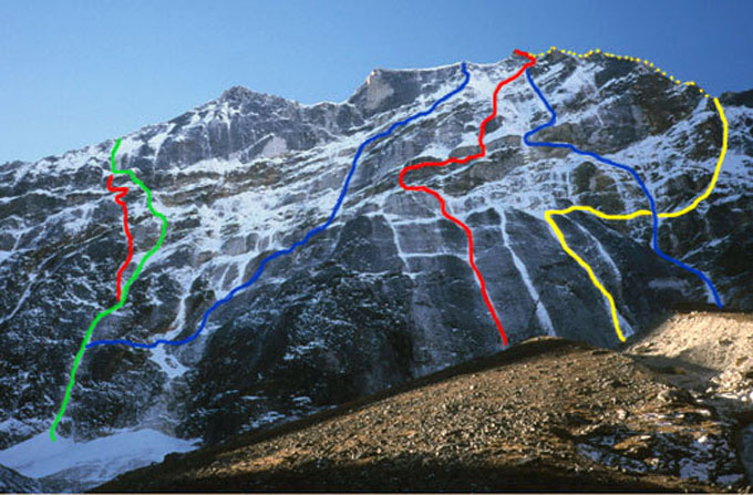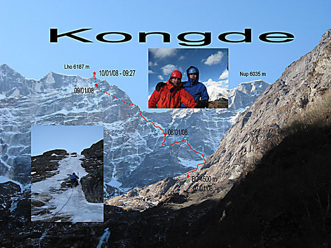 Часто стена становится непроходимой из-за полного отсутствия льда на маршрутах. Именно это мы и наблюдали в этом году. Тем не менее – найдя саму стену непроходимой – высмотрели возможность восхождения по бастиону между вершинами Lho и Nup массива Конгде. Система кулуаров, фирновых гребней и скальных стен, скупо покрытых натечным льдом, вывели нас на гребень между двумя пиками. Траверс по южной стене до южного гребня позволил выйти на классический маршрут, по которому мы и достигли вершины.