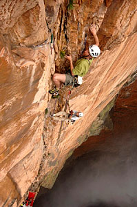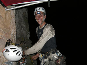 На никудышной страховке мы испытывали сильнейший мозговой штурм при попытке соединить восемь точек страховки. Nico дважды подряд упал на этой страховке. Хотя ты и стараешься убедить себя, что в сорока метрах ниже она присоединена к статической веревке, душа все равно уходит в пятки… В верхней части есть три участка, которые вообще невозможно пройти на ИТО, приходится просто лезть по этим опасным участкам уровня 7b+. И если они мокрые или если у тебя кончились силы, у тебя нет никаких шансов их пройти…