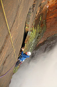 Итак. Мы были ошарашены. У подножия стены путь был просто ужасен! Вокруг все мрачно, водопад бьет прямо в лицо, над тобой нависает эта стена, и ты видишь, насколько там дерьмовый камень… Некоторые участки в самом деле ужасны! На одном из них все просто: если упадешь – погибнешь. При этом там нет расслабушного лазания, напротив - 7b+. Каждый участок мы классифицировали по трем категориям: опасный, очень опасный и супер-опасный! В итоге мы достигли вершины, проходя ключевые участки по очереди с Nicolas’ом. Там таких десять: от 7b до 7c/7c+. Каждый из них мы пробовали пройти онсайтом, даже те, которые оценены как A3 в лазании с ИТО. Пять из них мы прошли, остальные сделали с первой или со второй попытки с уже проложенными закладками.