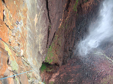 Суровое окружение благодаря водопаду (оглушительный рев и вода), постоянно нависающая ненадежная скала, постоянные опасения из-за ненадежности своих точек опоры, продолжительное тяжелое лазание и тяжелые отходы на две трети и вверх – все эти факторы в совокупности делают маршрут абсолютно уникальным. Команда 2006 считает это сложнейшим лазанием в своей жизни.