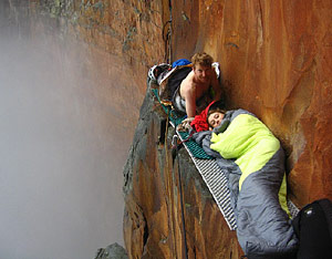 Но скала также становится привлекательной для лучших скалолазов мира (несмотря на то, что она отразила уже многие их попытки) прежде всего потому, что она представляет собой наверное самую большую нависающую стену в мире. В 1990 легендарный испанский скалолаз Jesus Galvez и Adolfo Medinabeitia совершили подвиг первопрохода дерзкого и экстремального маршрута с искусственными точками опоры, что заняло у них 26 дней… Двенадцать лет спустя John Arran поставил перед собой еще более сумасшедшую цель – пройти маршрут свободным лазанием. В апреле 2005-ого, после двух неудачных попыток предыдущих лет, он осуществил свою мечту за 19 дней с командой из семи человек (6 скалолазов). Маршрут был пройден свободным лазанием с разбивкой на 31 участок с несколькими альтернативными участками по сравнению с исходным вариантом, и уровень его оценивался очень высоко – 9 участков около E7. John Arran, Miles Gibson и Ben Heason по очереди лидировали на самых тяжелых участках. Маршрут назвали “Rainbow Jambaia”.